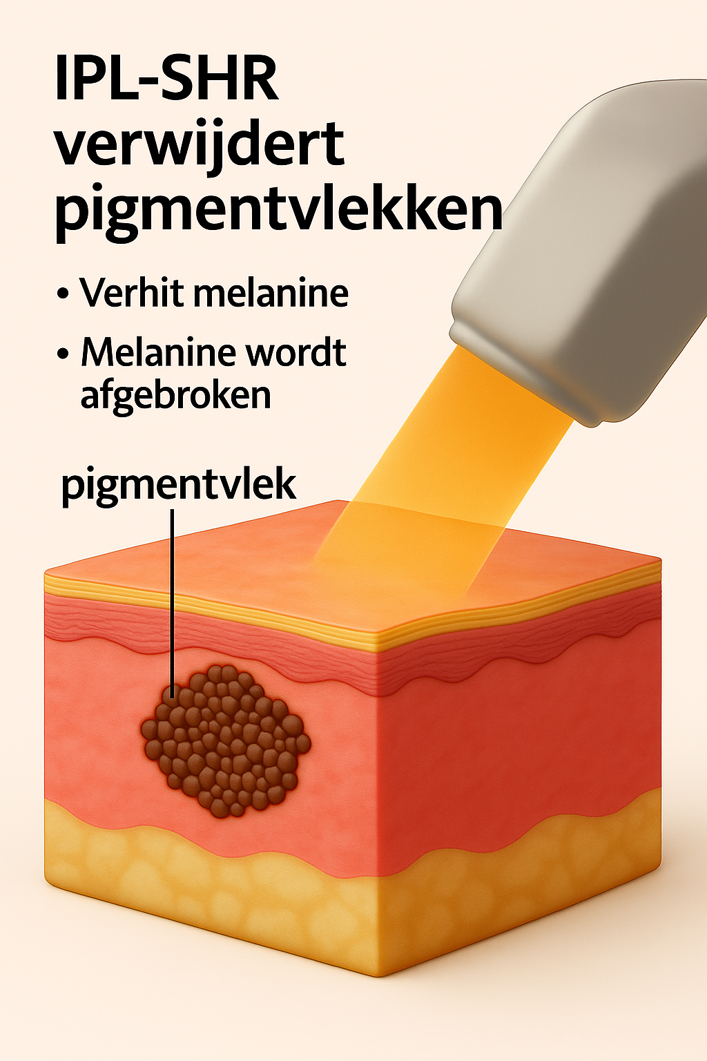 De IPL-SHR is een veilige en effectieve methode om verschillende vormen van oppervlakkige pigmentatie te behandelen. Denk hierbij aan storende ouderdomsvlekjes, zonschade of sproetjes. Het gepulseerde licht wordt gericht op de plek waar het pigment zich bevindt. Dit pigment absorbeert het licht, waardoor het wordt opgewarmd en uiteenvallen in microdeeltjes. Het lichaam ruimt deze restdeeltjes vervolgens zelf op, waardoor de pigmentatie zichtbaar vervaagt of volledig verdwijnt.i
