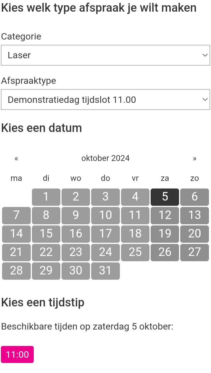 Tijdslot boeken in de online agenda, kies de optie: Laser + uw tijdslot + oktober RESERVEER